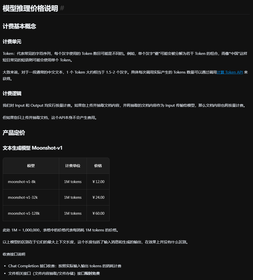 Moonshot/Kimi 的几个主力模型一般按 “每百万 tokens” 计价,比如 moonshot-v1-8k / 32k / 128k 等。