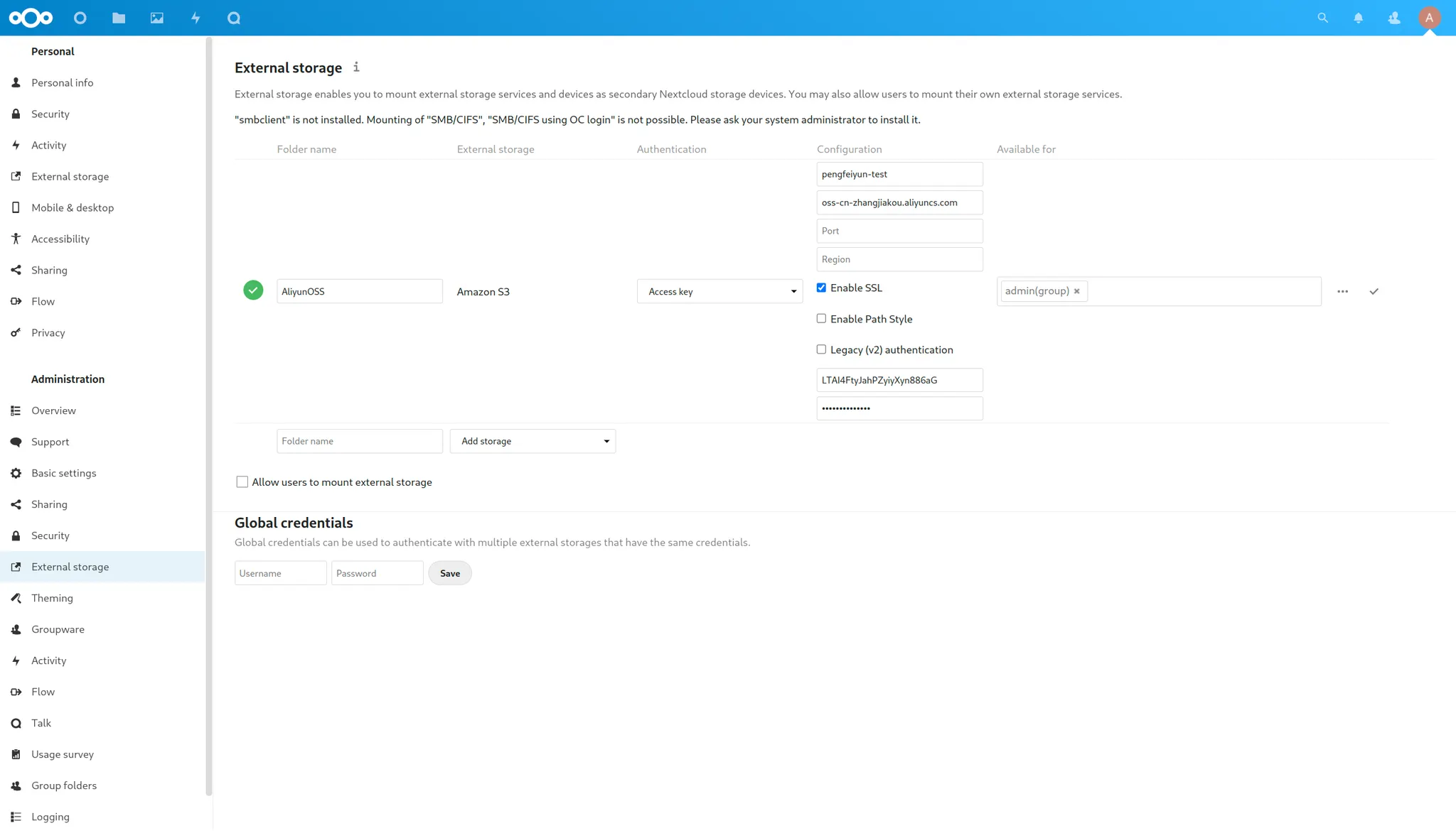 更多细节可参考官方文档: Configuring External Storage (GUI) — Nextcloud Admin Manual