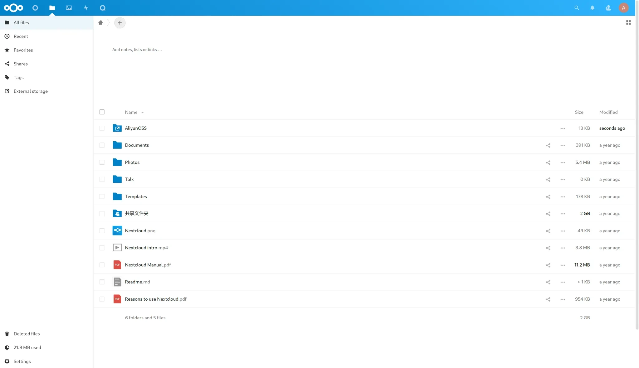 返回 Nextcloud 文件主界面,你会看到一个新出现的文件夹,例如 oss-share。打开后,即可像浏览普通文件夹一样访问 OSS 中的对象。