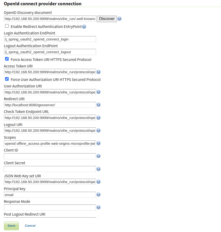 填好后,点击 Discover 按钮,GeoServer 会自动从这个 URL 读取 issuer、授权端点、Token 端点等信息,并填入下面的相关字段。