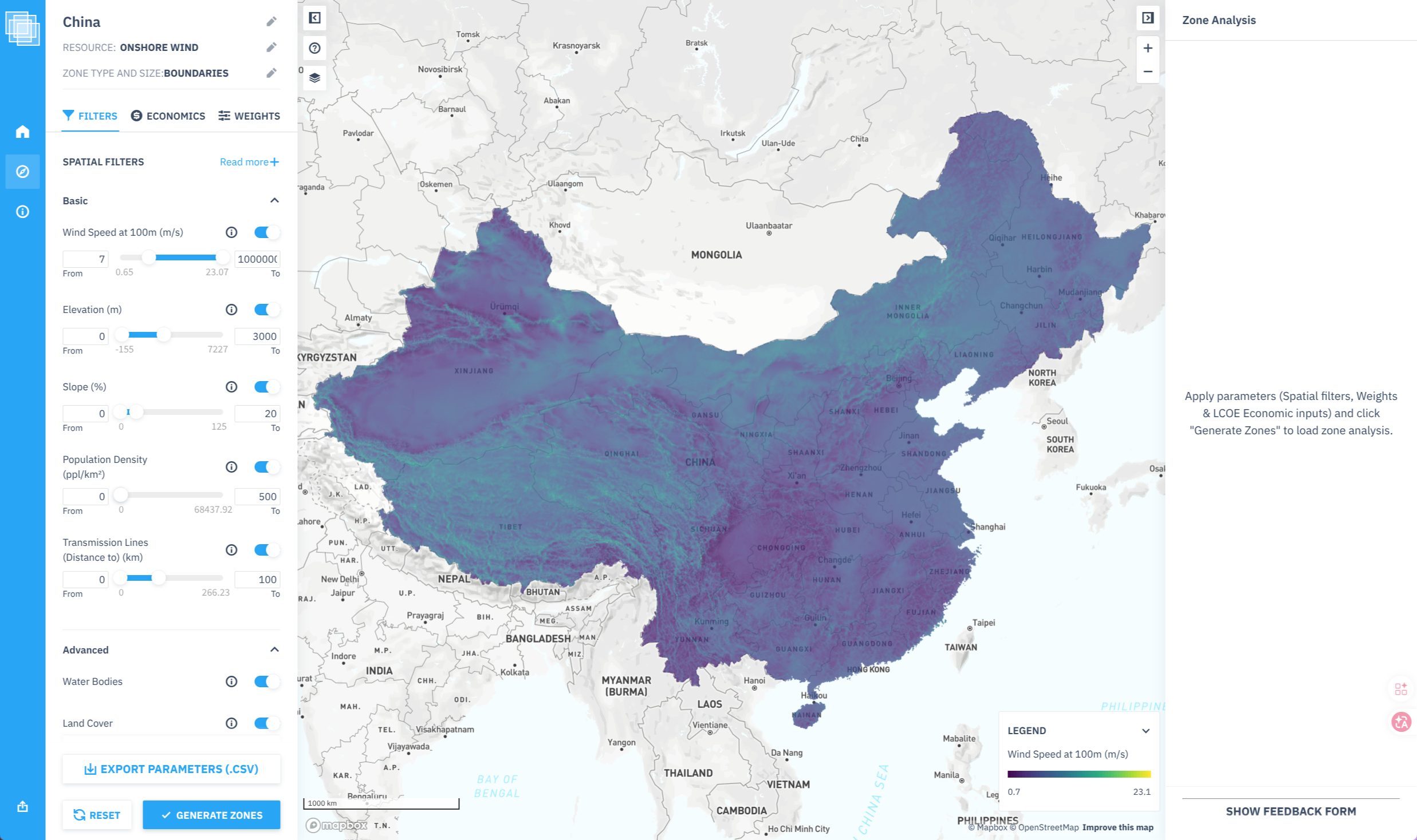 Wind Speed at 100m ≥ 7 m/s→ 过滤掉低风速区域Elevation 0–3000 m、Slope 0–20%→ 排除过高、过陡区域,兼顾工程可行性和成本