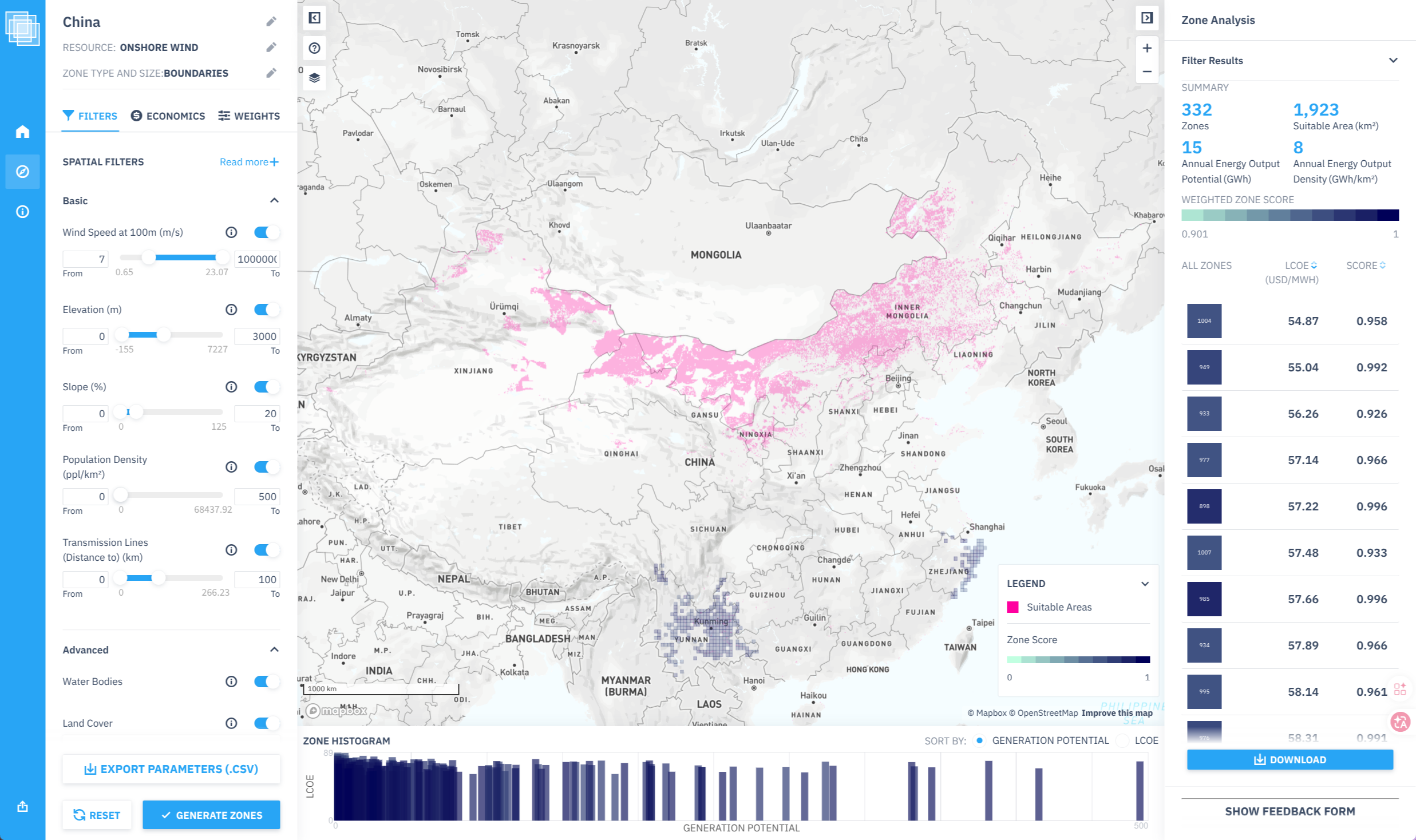lcoe:区域内 LCOE 栅格的平均值;zone_score:区域内综合得分的平均值;suitable_area:在当前 Filter 下,该区块的可开发面积;icp:按单位面积装机系数折算的潜在装机容量(MW);generation_potential:乘以区域平均 CF 和 8760 小时,得到年发电量(GWh);cf:区域内 CF 的平均值。